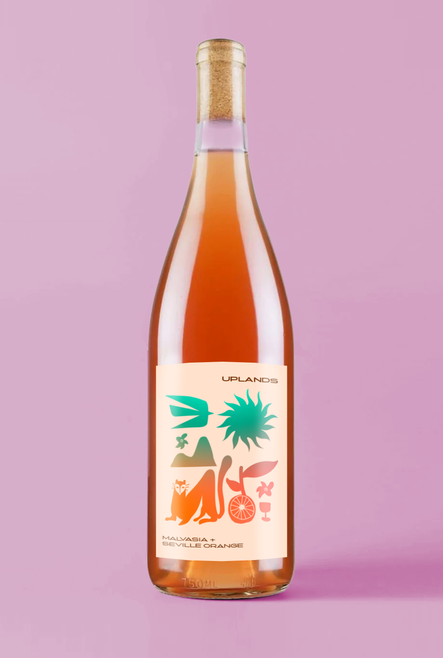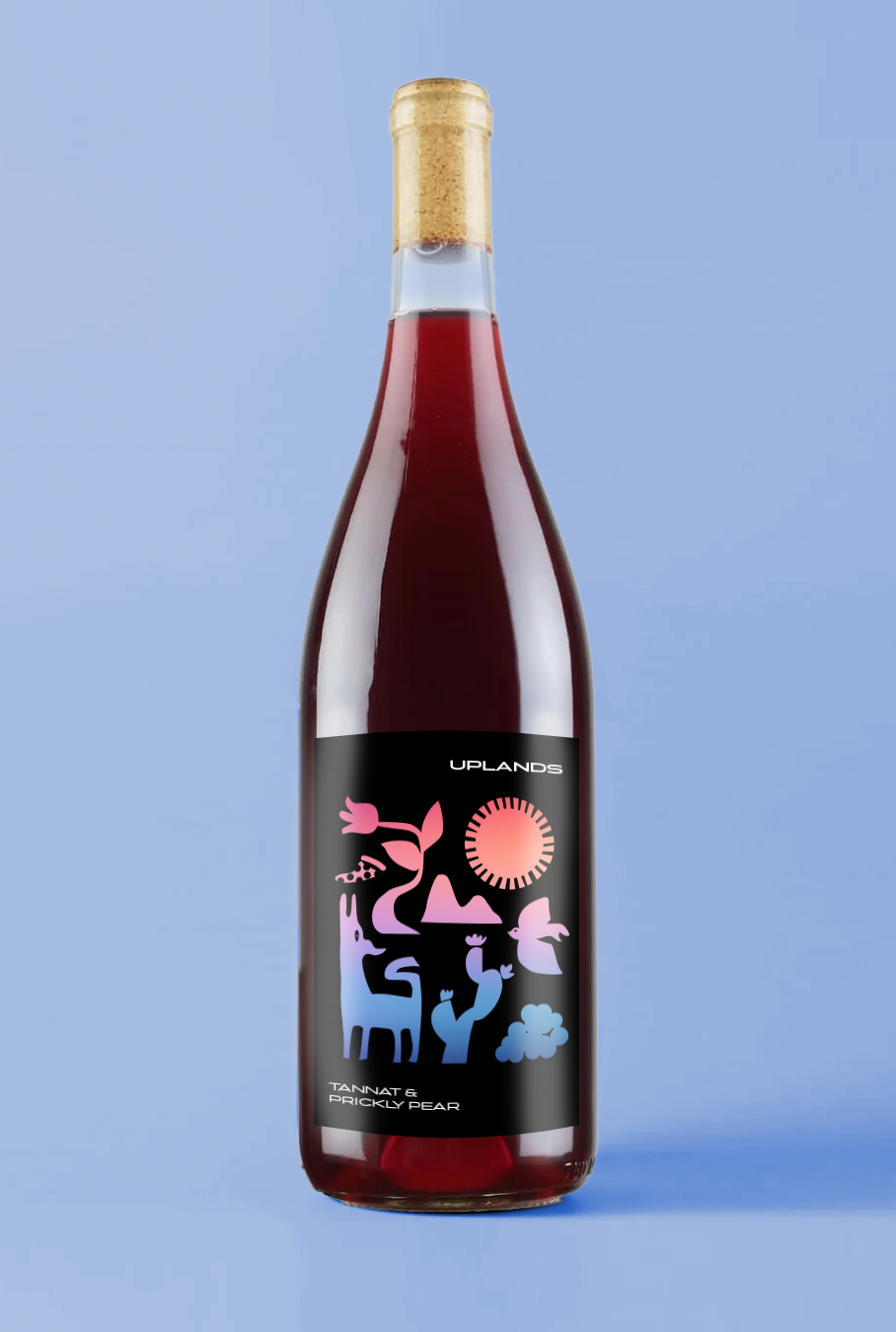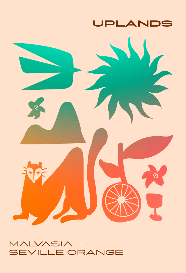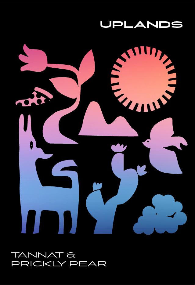 For his natural wine brand, we chose the name “Uplands” which directly spoke to the Arizona Upland biome of the Sonoran Desert from which all his wonderful inputs come from. Visually, we wanted to evoke images of the landscape (see: coati), as well as some lighter-hearted nods the vibe of the wine itself (see: pizza). The backfill is a spectrum meant to evoke the desert sunset and dusk.
