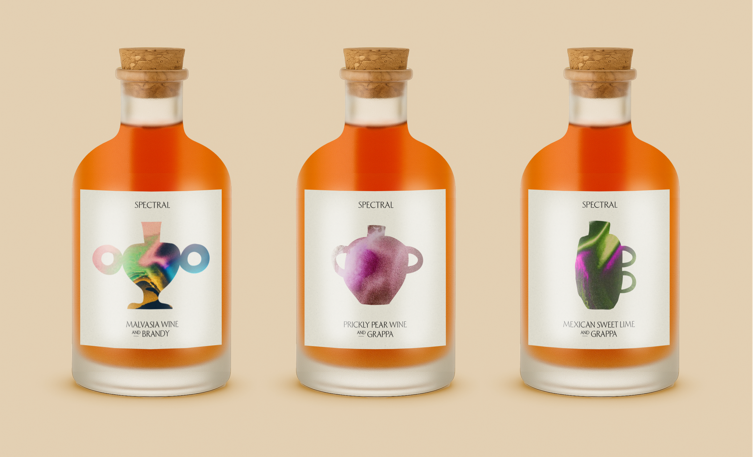 For Rob’s fortified wines, we aligned on the name “Spectral,” which pointed to the range of flavors possible when blending. Visually, we aligned on something clean and elegant, with simple shapes that pointed toward ancient vessels, a nod to lost alchemical arts and elixirs.